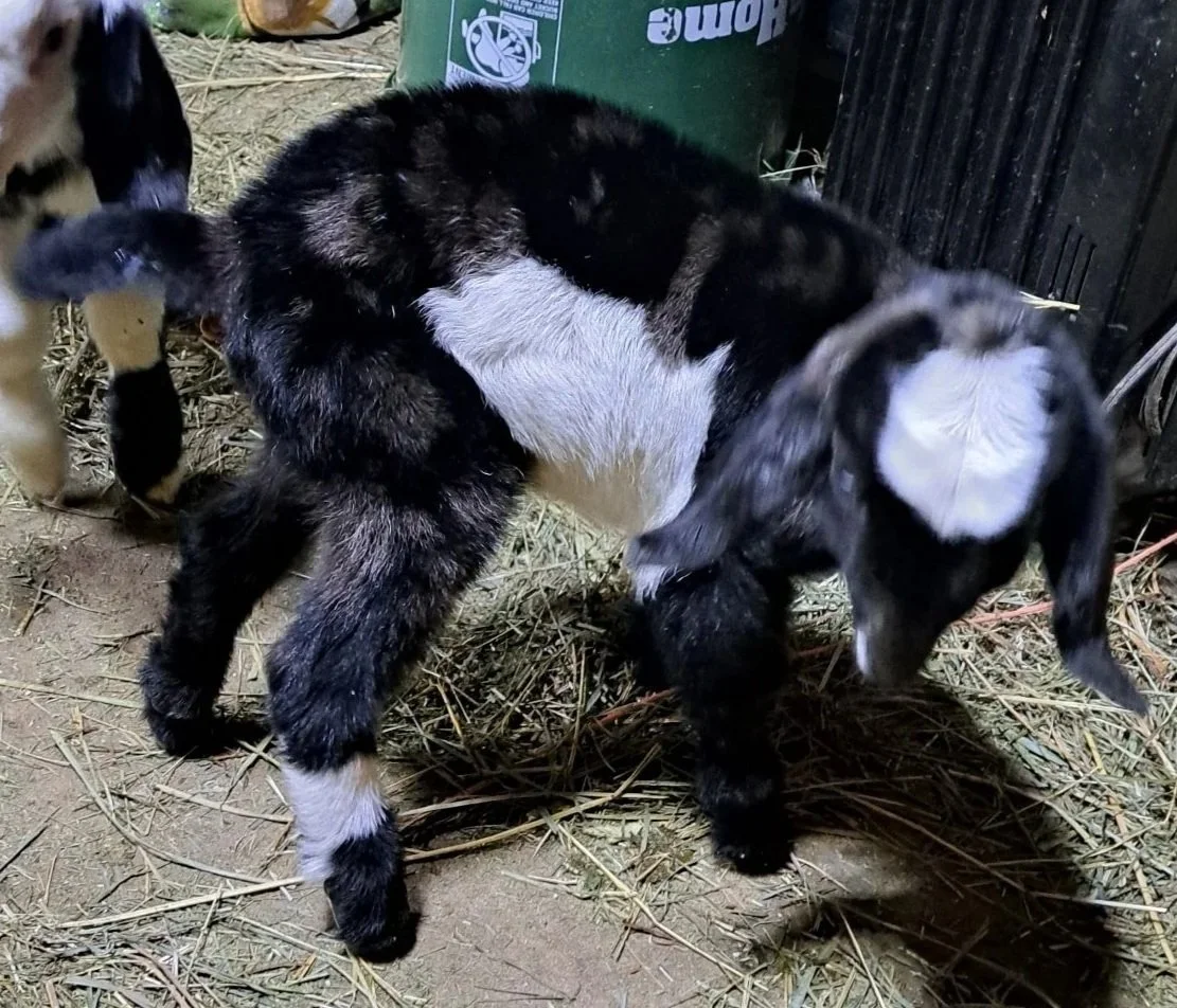 Promise is a well mannered girl, she is very hardy and was last wormed as a yearling. She has excellent slower growing hooves. She is a short girl and is deep bodied (she was under 2 years old in her posed picture) she is long & level looking with good width. She is more Nigerian in body style than Nubian (has a shorter leg appearance as her barrel deepened).